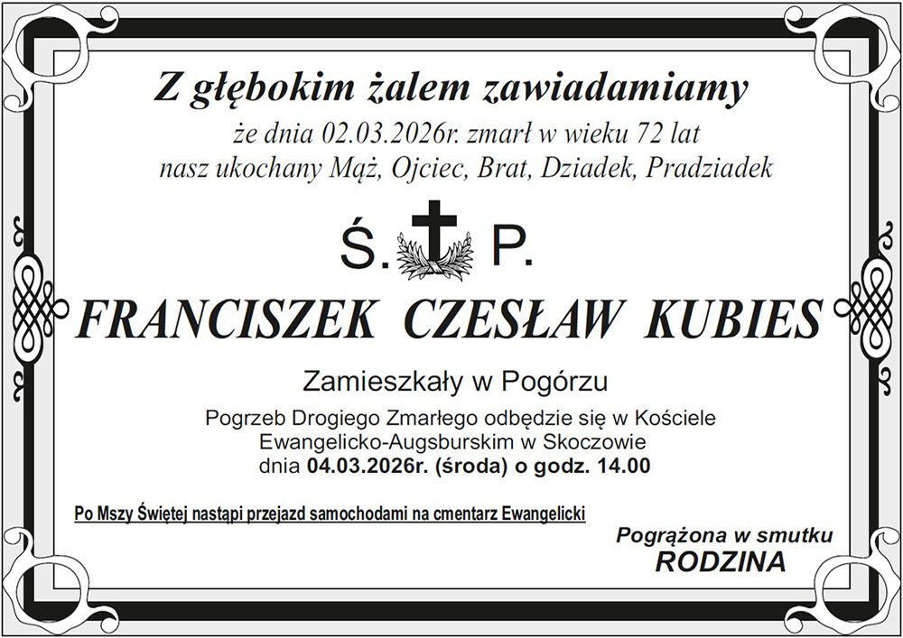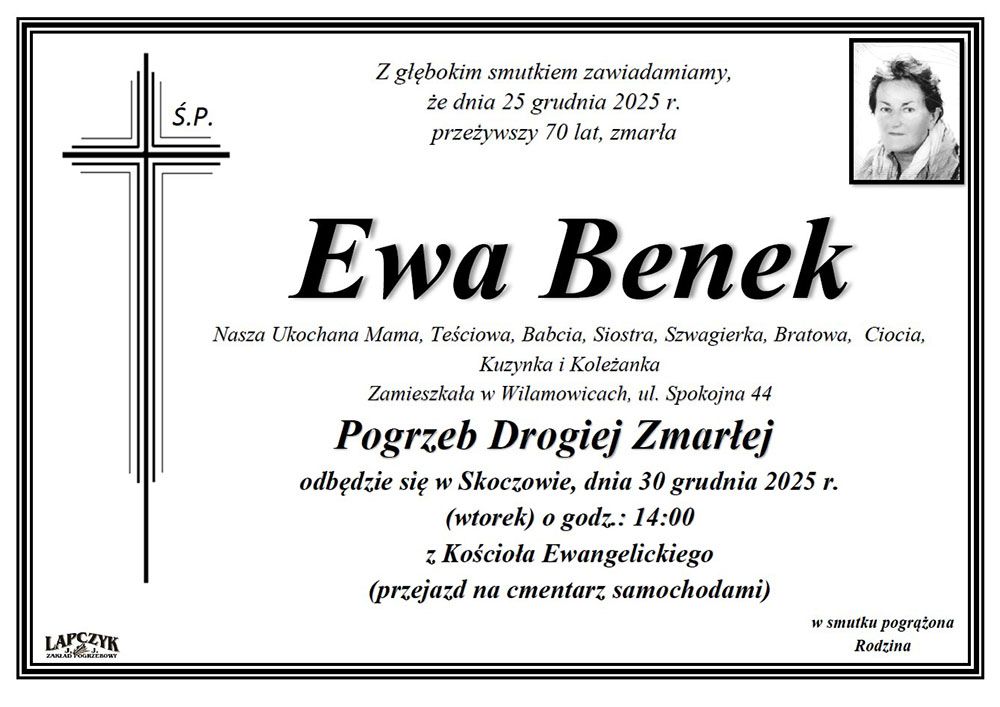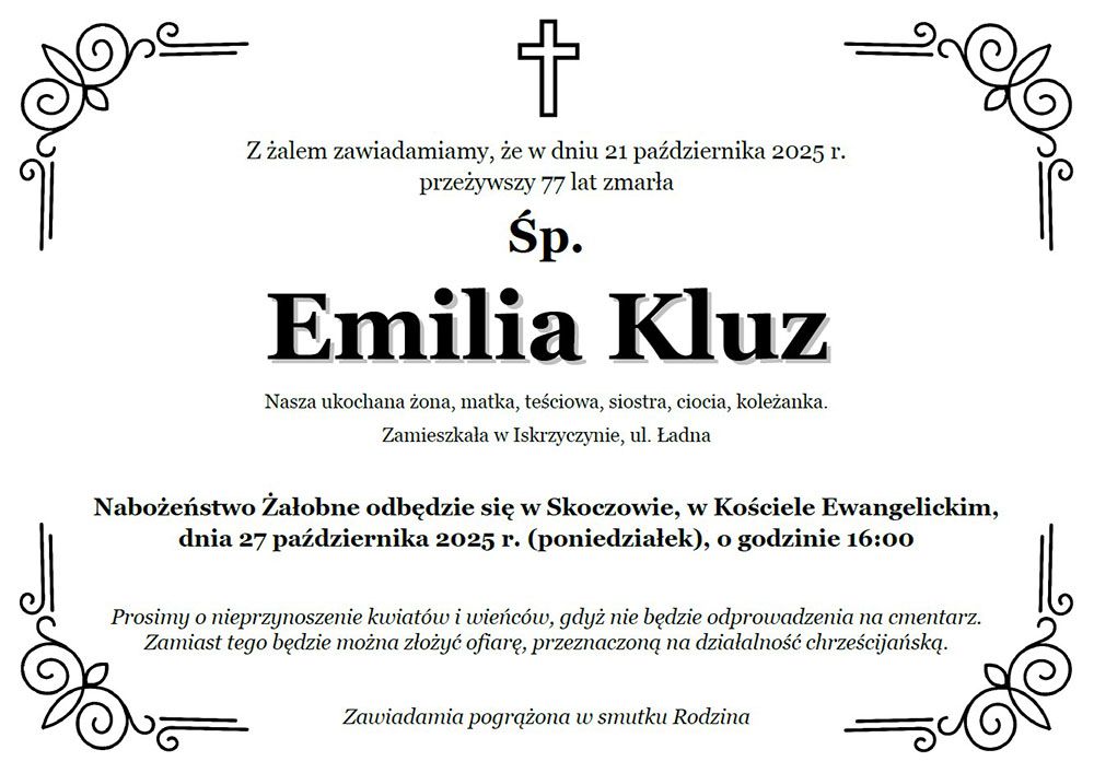 Osoby załatwiające formalności pogrzebowe prosimy, aby poprosiły zakład pogrzebowy o przesłanie nekrologu na adres mailowy PEA w Skoczowie (skoczow@luteranie.pl).
